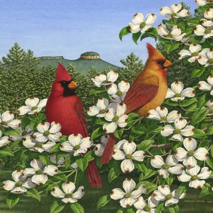 Dempsey has portrayed a pair of cardinals on the limb of a dogwood which is in full bloom. It is the nesting season and the cardinals, who mate for life, are looking for the ideal spot to raise their family.