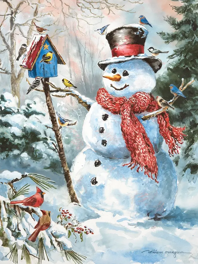 Frosty's Feathered Friends have joined him for a visit on a snowy winter morning. This puzzle is the perfect activity for a snowy winter day. Suitable for framing.