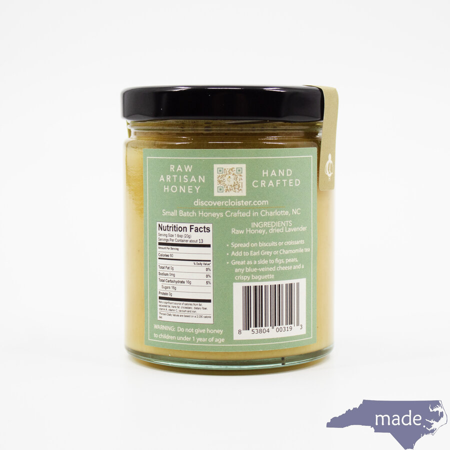 Provence, France is famous for it's rolling fields of lavender where the best, true lavender honey is produced from its nectar. We can't transport our hives to this stunning environment so our North Carolina version uses the second best thing to lavender nectar - the actual flower. Floral .. but not too floral ... open a jar and travel to the south of France.