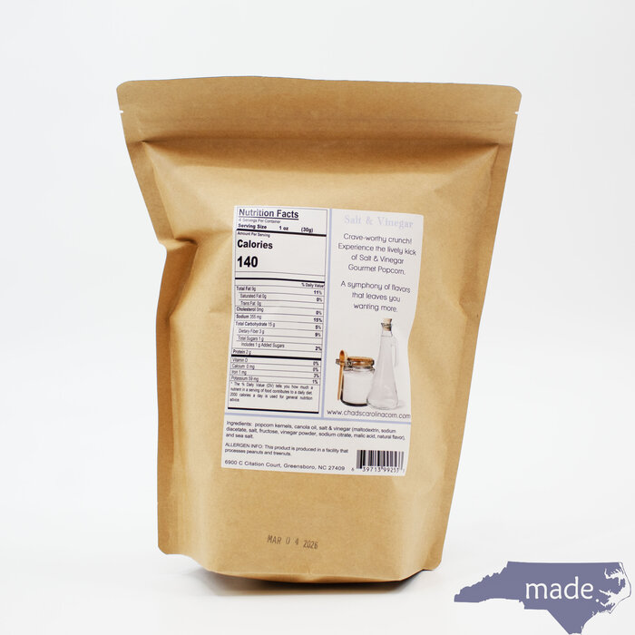 Ingredients: Popcorn Kernels, Canola Oil, Salt & Vinegar (Maltodextrin, Sodium Diacetate, Salt, Fructose, Vinegar Powder, Sodium Citrate, Malic Acid, Natural Flavor), and Sea Salt.