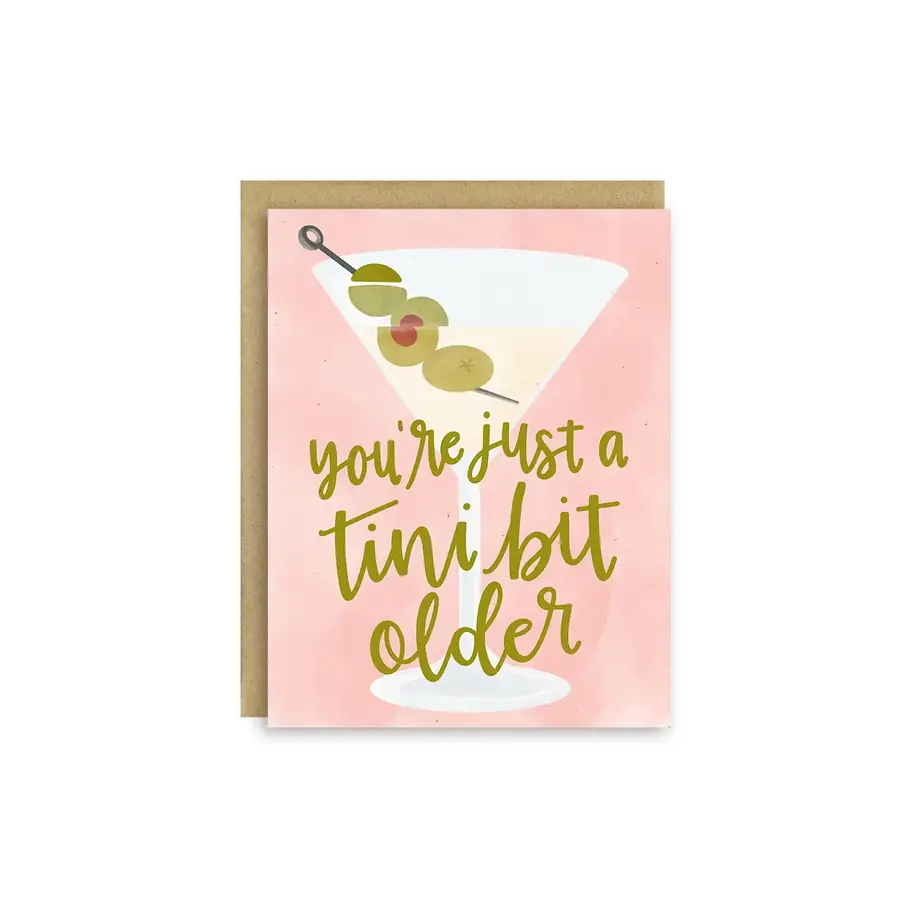 Celebrate another year of fabulousness with our cheeky birthday greeting card featuring a stylish dirty martini! The front proudly declares, "You're just a tini bit older," perfectly capturing the essence of growing up while staying young at heart.